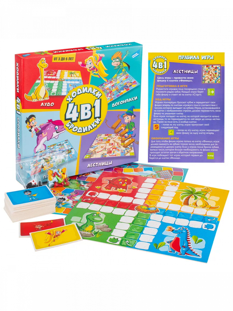 Игра детская настольная Ходилки-Бродилки 4 в 1. Представляем вам коллекцию из 4-х самых популярных и увлекательных настольных игр! Отправляйтесь в волшебное путешествие в игре "Лестницы": бросая кубик, передвигайте фишки и, попадая на клетки с лестницами и стрелками, перемещайтесь вверх или вниз по игровому полю. Помогите динозаврам добраться до своих гнёзд в игре "Лудо": проведите свои фишки вокруг игрового поля и выстройте их на финишной линии. Станьте супергероем и спасайте мир в игре "Догонялки": доберитесь до конца игрового поля быстрее всех, используя для передвижения специальные цветовые карточки вместо кубика. Заполучите пиратские сокровища в игре "Преграды": выстраивайте стратегию, преодолевайте преграды и выставляйте их соперникам на пути к финишу. Приключения ждут! Все игры просты в освоении и предназначены для 2-4 игроков в возрасте от 3 до 6 лет. Состав игры: Игровые поля (двухсторонние): 2 шт. Игровые карточки: 25 шт.; Игровые фишки: 27 шт; Игровой кубик: 1 шт.; Правила игры.